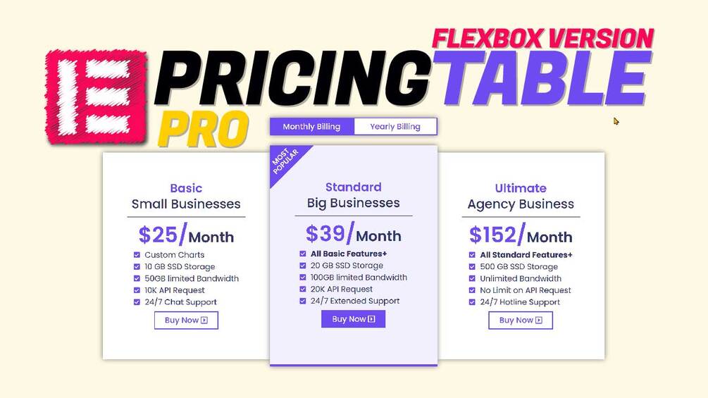 This advanced pricing table is ideal for creating a beautiful and functional Elementor Pro pricing table for any type of website that uses Elementor's brand-new revolutionary flex-box container layout.