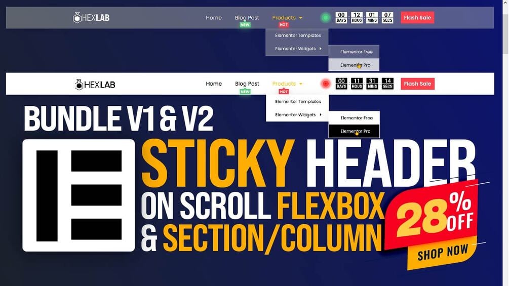 Elementor Pro Sticky Header-Version 1 & 2 - Flexbox + Section/Column - Bundle